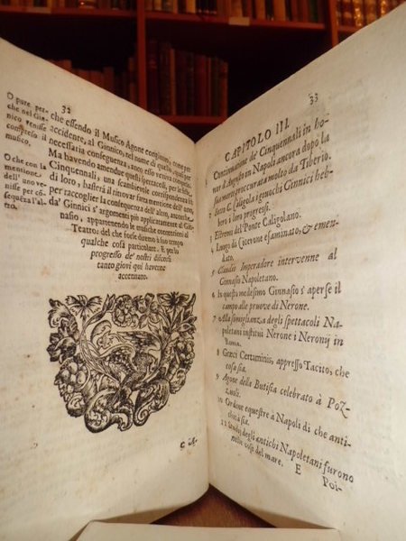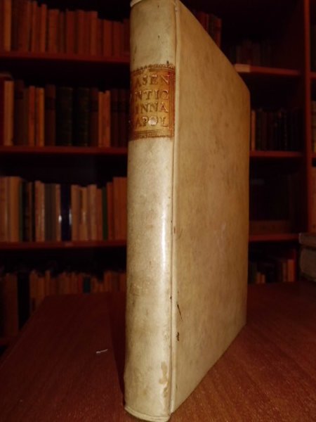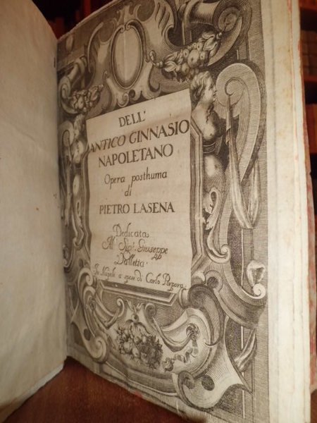 ASENA, Pietro. Napoli, a spese di Carlo Porpora, s.d. (1688). Dell' antico Ginnasio napoletano. Opera postuma. In - 4° antico, pergamena coeva. Frontespizio racchiuso in cornice ornata inciso in rame, (20), 229, (3) pp. Bell' esemplare. Edizione originale ed unica. Uff. Mob. 2.