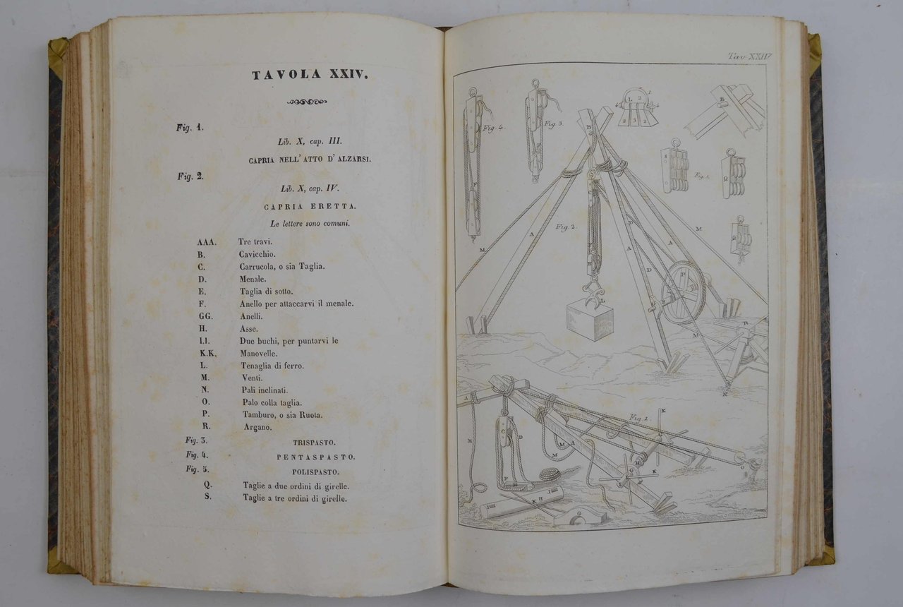 Con 28 tavole f.t. incise in rame. Unito a: Antico compendio di architettura di anonimo scrittore emendato dal March. Luigi Marini e recato in italiano con note dall'ab. Giovanni Berengo. Venezia, 1855. Unito a: FRONTINO SESTO GIULIO. Opere... Venezia, 1855. Tre opere in un volume di cm. 26, pp. 1.000 ca. complessive. Solida legatura coeva in mezza pelle, dorso a nervi con titoli e filetti in oro e fregi a secco. Ben conservato. Nitida edizione che presenta il testo originale latino con la traduzione italiana a fronte. Fa parte della collana "Biblioteca degli scrittori latini con traduzione a fronte".