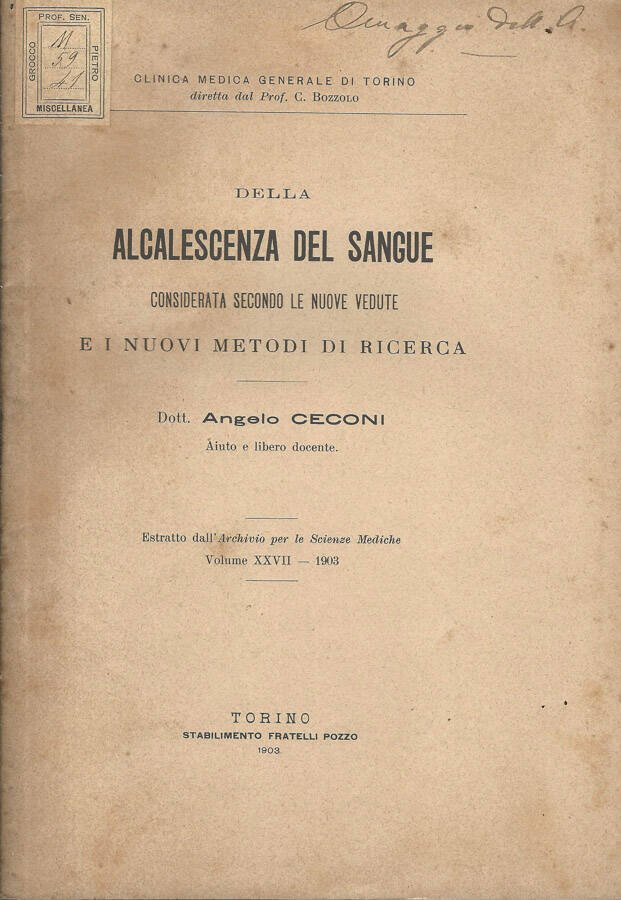 Piatti con lieve imbrunitura, prima di copertina con etichetta della precedente biblioteca di appartenenza ed annotazione a penna, pagine naturalmente imbrunite, testo completamente fruibile, pubblicazione della Clinica Medica Generale di Torino (diretta dal prof. C. Bozzolo), estratto dall' "Archivio per le Scienze Mediche" Vol. XXVII - n. 10, con tabelle nel testo, note a piè di pagina, numero pagine 40