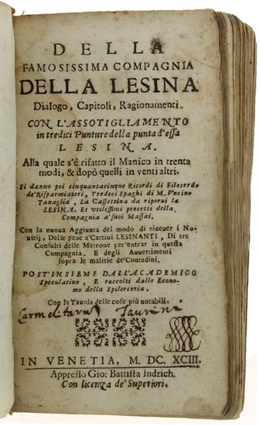 DELLA FAMOSISSIMA COMPAGNIA DELLA LESINA Dialogo, Capitoli, Ragionamenti. Con l'assotigliamento in tredici Punture della punta d'essa lesina. Alla quale s'è rifatto il Manico in trenta modi, & dopò quelli in venti altri. | Libri antichi e moderni |