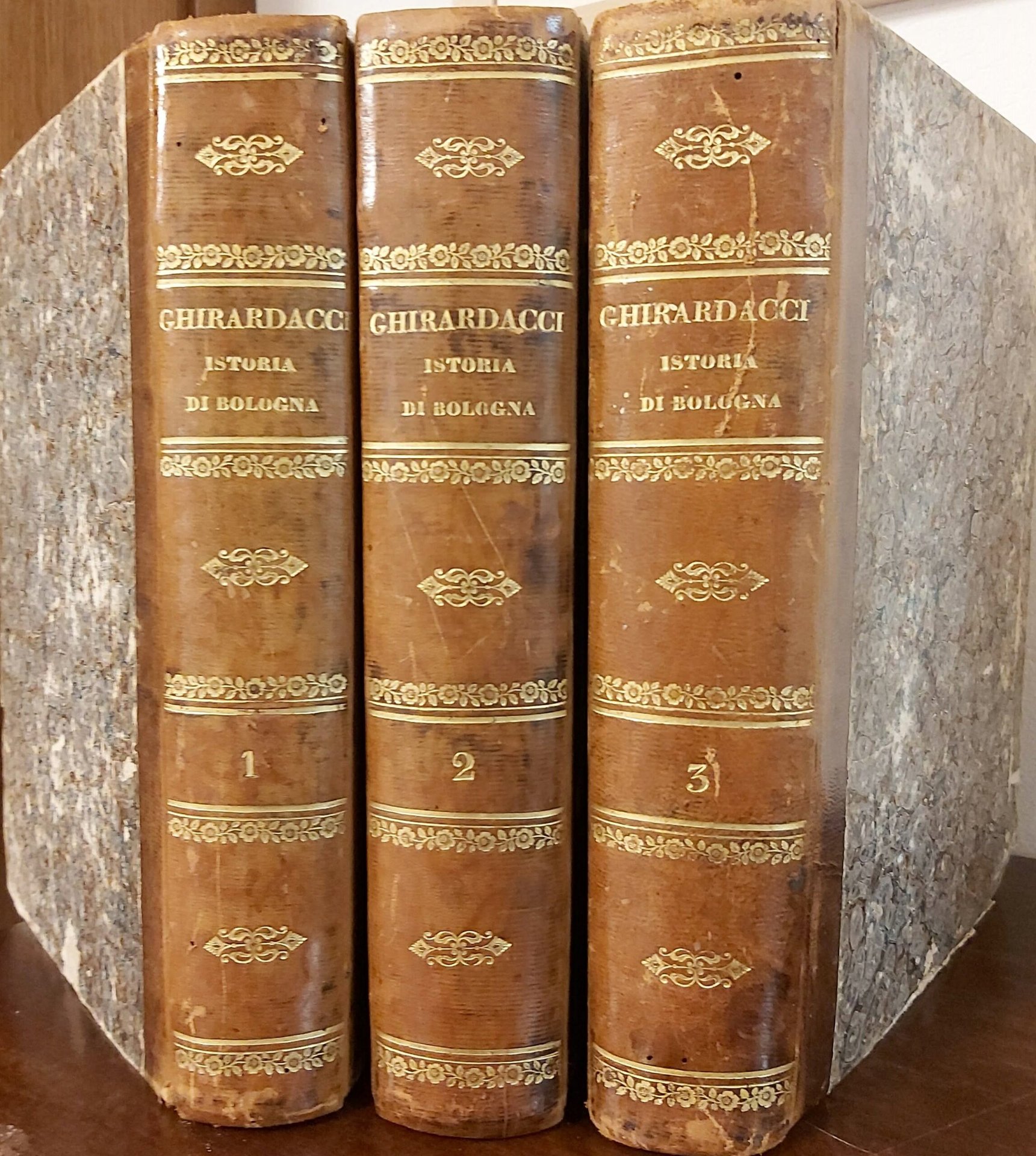 3 gr. voll. in folio, pp. (48), 612, (168); (24), 648, (184); (24), 25-836, (10), bella leg. uniforme settecentesca m. pelle con fregi e tit. oro ai d., piatti in carta marmorizz. A pag.90 del primo vol. grande incisione in legno del Carroccio. Ottima copia della rara storia bolognese del Ghirardacci, in edizione originale per il primo e secondo volume. L'opera del padre agostiniano (Bologna 1519-1598) fu criticata e osteggiata dal Senato di Bologna perchè alcune parti storiche non potevano essere confermate e altre era meglio non ricordare, nonostante avesse già ricevuto il privilegio alla stampa dal Ponteficie Sisto V. La sopraggiunta morte dell'A. rallentò la pubblicazione dell'opera il cui secondo volume vide la luce solo nel 1657 per iniziativa dello storico agostiniano Aurelio Solimani. Per il terzo volume si dovrà attendere la metà del Settecento quando alcuni eruditi vi misero mano contattando la tipografia nuova tipografia Venturini di Lucca. Quando l'edizione era ormai pronta per la stampa nel 1758 il marchese Guido Bentivoglio sollevò alcune obiezioni su alcuni fatti che avrebbero gettato ombre sulla sua famiglia d'origine, e chiedendo l'appoggio adirittura del papa Benedetto XIV Lambertini, acquistò tutte le copie del volume e le distrusse, salvandone solo una copia che conservò nel suo Archivio di famiglia (ora all'Archiginnasio di Bologna). Il nostro terzo volume è interamente manoscritto il cui frontespizio recita: "Historia di Bologna / del R. P. Maestro / Cherubino Ghirardacci / Bolognese / Dell'ordine Eremitano di S. Agostino / Parte Terza / Manoscritta / ed estratta dalla Libraria del Convento / di S. Giacomo Maggiore / di Bologna / l'Anno / 1734". Al verso del medesimo: " DellaHistoria di Bologna [.] Libro Vigesimo Settimo / Nel Tomo secondo stampato vi è questo libro Vigesimo Settimo [.] Molte cose sono nel terzo manoscritte e / non nel stampato, ed alcune sono nel stampato / e non nel manoscritto [.]". Alcuni insignificanti forellini di tarlo marginali al front. e prima carta Belliss. esempl. a larghi margini. [392]