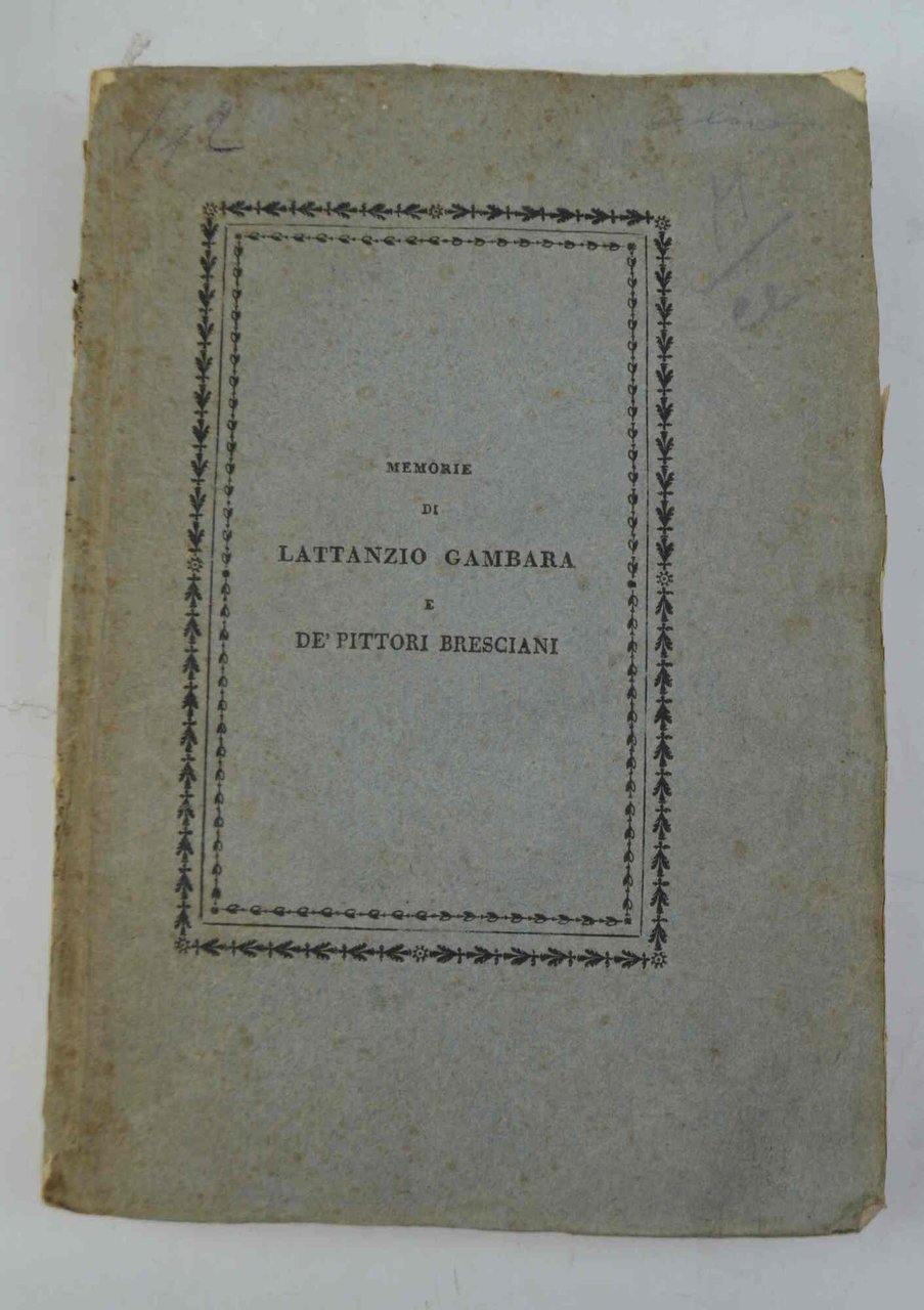 Cm. 23,5, pp. (8) 216. Con ritratto del Gambara inciso in rame all'antiporta. Bross. edit. con titoli a stampa. Qualche segno d'uso al dorso ed una piccola mancanza al piatto posteriore della brossura, peraltro esemplare genuino, marginoso ed in buono stato di conservazione. Ampia e documentata biografia sul pittore bresciano del '500, ricca di notizie storiche sulla città lombarda e la vita artistica del tempo. Cfr. Cicognara 2334.