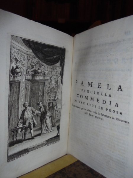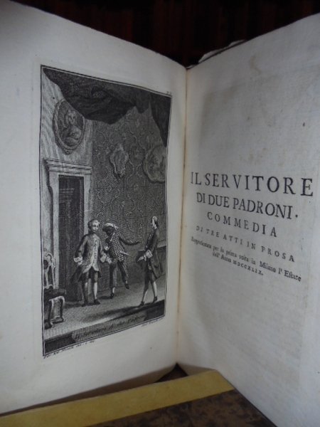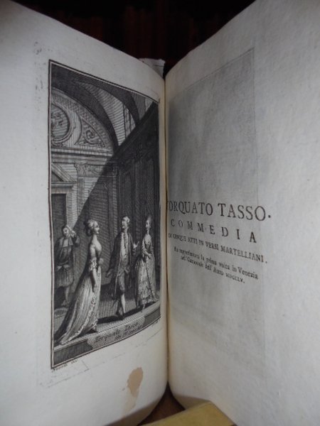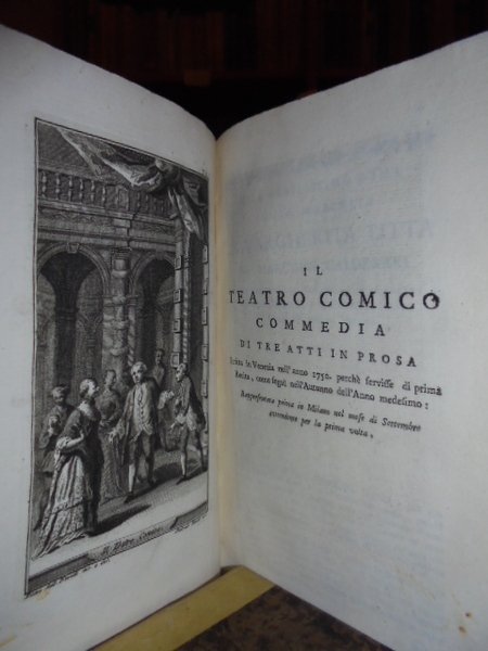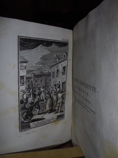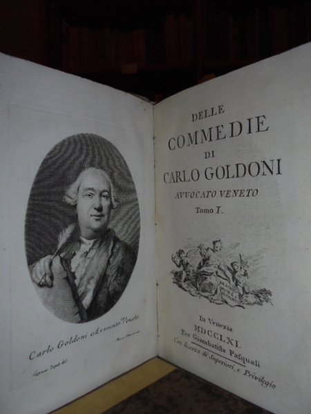 (Teatro veneziano) GOLDONI, Carlo. Venezia, Giambattista Pasquali, 1761. Delle commedie. 16 volumi in - 8°, rilegati come segue: dal I° all' VIII°, XI° - XII°, XV° - XVI° a doppio volume in pergamena coeva; il IX° e il X° a volumi singoli in pelle coeva; il XIII° e XIV° in m. pergamena ottocentesca. Complessive 5450 pp. con ritratto del Goldoni disegnato da Lorenzo Tiepolo, inciso da Marco Pitteri, altro ritratto e numerose tavole incise in rame dal Baratti da disegni di Pietro Novelli f.t. Come in molti esemplari, manca il vol. XVII. Alla fine di qualche volume sono aggiunti alcuni opuscoli settecenteschi. Pregevole edizione illustrata che il Gamba (Serie degli scritti impressi in dialetto veneziano, p. 152) così si esprime << Quantunque non completa, merita nulladimeno particolare stima questa edizione fatta sotto gli occhi dell' autore, il quale corredò le commedie scritte nel dialetto veneziano della spiegazione di quelle voci che ad un forestiere possono riuscire poco intellegibili >>. Spinelli, Bibliografia Goldoniana, pp. 97 - 131.