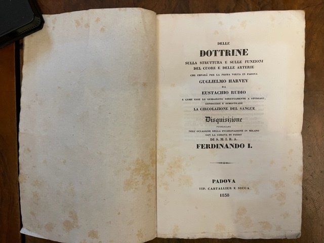 Delle dottrine sulla struttura e sulle funzioni del cuore e delle arterie che imparò per la prima volta in Padova Guglielmo Harvey da Eustachio Rudio e come esse lo guidarono direttamente a studiare, conoscere e dimostrare la circolazione del sangue. Disquisizione | Libri antichi e moderni | Zecchinelli, Giovanni Maria