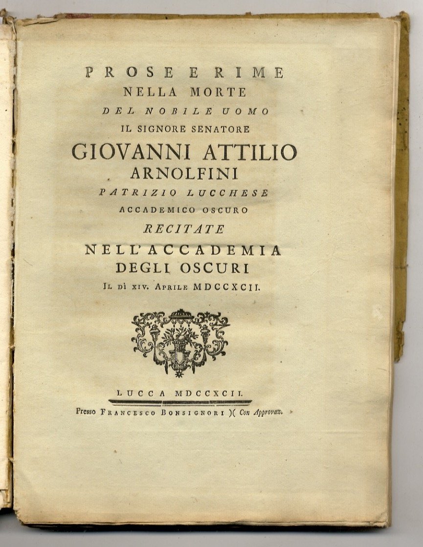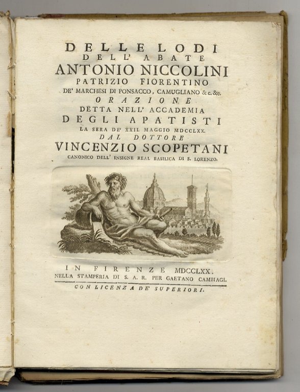 Delle lodi dell'abate Antonio Niccolini patrizio fiorentino de' Marchesi di Ponsacco, Camugliano &c. &c. Orazione detta nell'Accademia degli Apatisti la sera de' XXII maggio MDCCLXX (.) Firenze, Stamperia di S.A.R per Gaetano Cambiagi, 1770, in-4, pp. XXXI, (1). Bella vignetta inc. in rame (figurazione dell'Arno con veduta di Firenze sullo sfondo) al frontespizio. (Unito:) ALAMANNI Vincenzo In funere Ludovici XIV, christianissimi Galliarum regis oratio (.) ad SS. dominum nostrum Clementem undecimum pontificem maximum a Vincentio Alamanno (.) Romae, typis Jo. Mariae Salvioni, 1716, in-4, pp. (8), XXXIV. Frontespizio in rosso e nero con vignetta, finalino e 2 iniziali abitate, inc. finemente in rame. (Unito:) VENTURINI Giusto L'Eroe dell'Amor