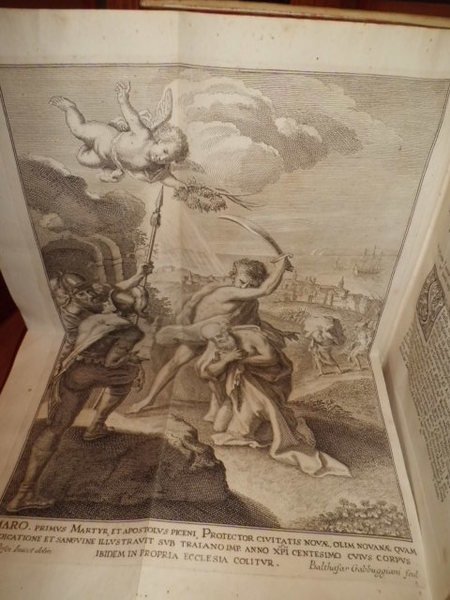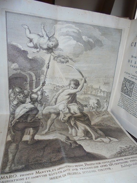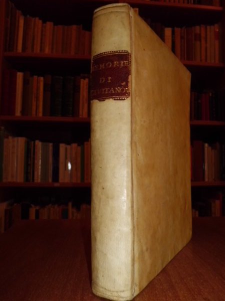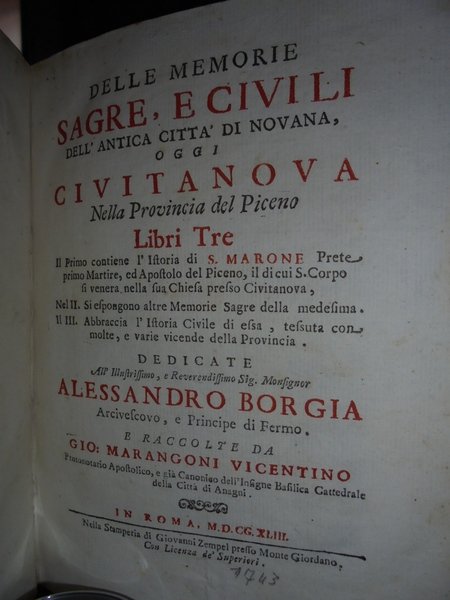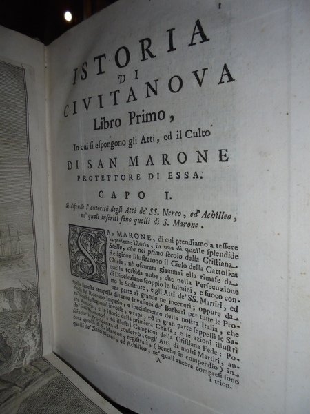 Marangoni, Giovanni. Roma, Giovanni Zempel, 1743. Delle memorie sagre e civili dell' antica città di Novana, oggi Civitanova nella provincia del Piceno libri tre. Il primo contiene l' istoria di S. Marone. Nel secondo si espongono altre memorie sagre della medesima. Nel terzo abbraccia l' istoria civile di essa, tessuta con molte e varie vicende della provincia. In - 4°, pergamena coeva. xvi, 401, (3) pp., con una splendida tavola f.t. incisa in rame ripiegata illustrante il martirio di S. Marone e, sullo sfondo veduta di Civitanova. Bell' esemplare dell' edizione originale. Lozzi, 1267: << Non comune >>. Uff. Mob. 1