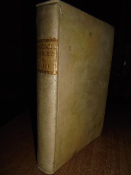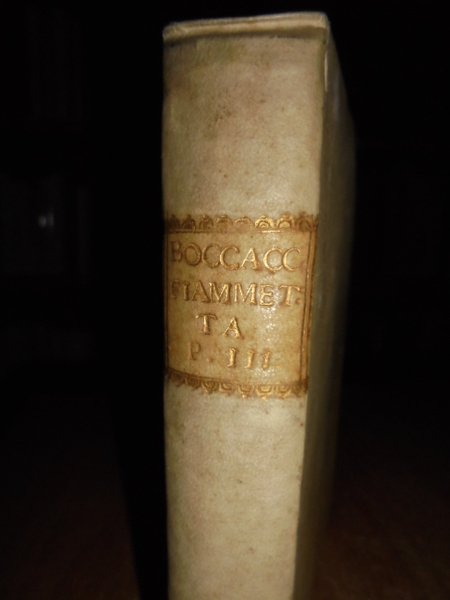 Giovanni, Boccaccio. Firenze, S.E., 1723. DELLE OPERE DI M. GIOVANNI BOCCACCI CITTADINO FIORENTINO IN QUESTA ULTIMA IMPRESSIONE DILIGENTEMENTE RISCONTRATE CON PIÙ ESEMPLARI, ED ALLA SUA VERA LEZIONE RIDOTTE. La Fiammetta. Il Corbaccio.Novellamente stampato, e con i riscontri di testi a penna alla sua vera lezione ridotto. Terzo tomo delle 'Opere' del Boccaccio, uscite a Napoli con la falsa indicazione di Firenze. In-16°, pergamena coeva con titolo in oro entro tassello sul dorso. Due frontespizi figurati col frullone della Crusca. (4), 172, (4) pp., 1 f. bianco.; (2), 88 pp., 1 f. bianco. Esemplare ben conservato. Neg. mass.