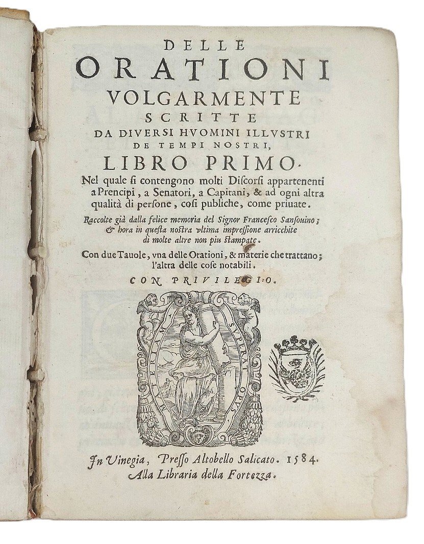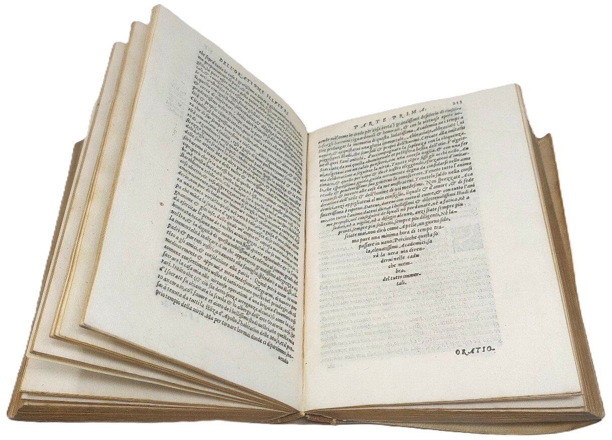 >2 vol. in 1 tomo in-4, ff. (12), 284 (i.e. 283), 1 foglio bianco; 131, 1 bianco; leg. coeva in p. pergamena, titolo manoscritto al dorso, tagli dorati. Impresa tipografica su entrambi i fogli di titolo, fregi ed iniziali xilografici, carattere corsivo. Edizione definitiva ed in parte originale, ampliata e rivista dall'autore, il quale riunì nel secondo libro 24 orazioni inedite. La raccolta contiene il meglio dell'arte oratoria sacra e profana del tempo, concernente una quantità d'argomenti politici, storici, letterari, d'occasione,... Tra i più noti autori citiamo Bembo, Della Casa, B. Cavalcanti, A. Lollio, P. Paruta, F. Fiorentino, L. Salviati, Cl. Tolomei, B. Tomitano, G.G. Trissino, B. Varchi, P. Vettori. Molte di queste orazioni interessano personaggi, fatti, città e località della Lombardia e del Veneto. Ottimo esemplare (lieve alone nel margine in fine vol.), ex-libris al contropiatto anteriore e timbro al frontespizio. Gamba 1548. STC 607.