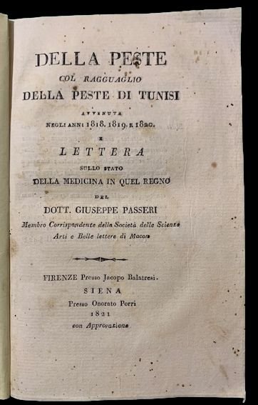 In 8° (20,5x13,3 cm); IV, 112 pp. e una grande c. di tav. fuori testo più volte ripiegata. Brossura novecentesca marmorizzata. Rarissima prima edizione di questa monografia del medico Giuseppe Passeri della peste che colpì Tunisi tra il 1818 ed il 1820. L'opera analizza la storia delle epidemie di peste che colpirono il territorio di Tunisi nel corso della storia per studiare da testimone oculare l'ultima virulenta epidemia, descriverne il propagarsi e le cure adottate per contenere il contagio e guarire gli infetti. La grande tavola fuori testo contiene le "Osservazioni Termometriche e Meteoriche e Barometriche trasmessemi dall'illustriss. Sig. Giuseppe-Emilio Ambert Maggiore del Genio al Servizio di S. M. il Re dei Paesi Bassi, e stato in Tunisi direttore delle Fortificazioni alla Goletta. L'ultimo capitolo, scritto da Giacomo Barzellotti professore di medicina presso l'Università di Pisa che descrive lo "stato della Medicina nel Regno di Tunisi". Un leggerissimo alone al frontespizio, ininfluente e per il resto esemplare in buone-ottime condizioni di conservazione. Raro.