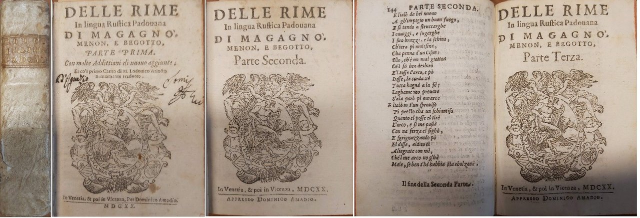 DELLE RIME in lingua Rustica Padovana di Magagnò, Menon e Begotto. Et co’l primo Canto di M. Lodovico Ariosto nuovamente tradotto.