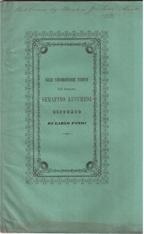 Delle straordinarie esequie dell'Avvocato Serafino Lucchesi celebrate nella chiesa di S. Francesco di Lucca il giorno 4 di marzo 1865 Discorso di Carlo Petri e iscrizioni
