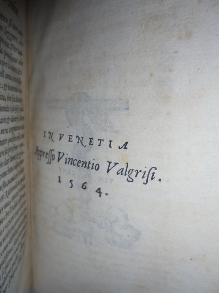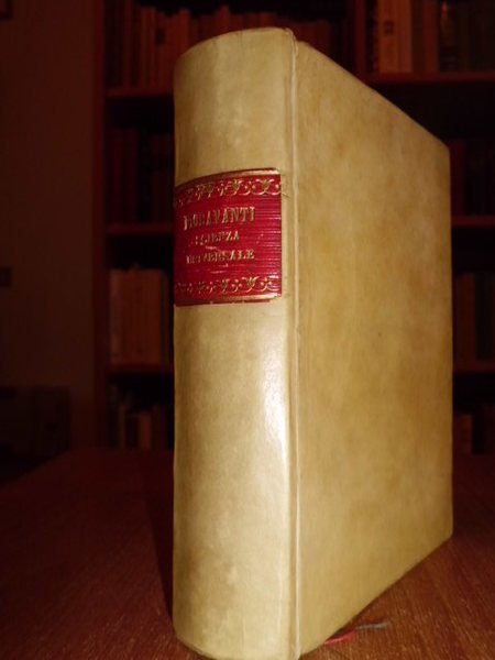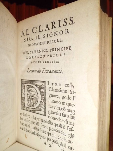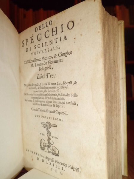 Dello Specchio di Scientia universale dell' Eccellente Medico, et Cirugico M. Leonardo, Fioravanti bolognese. Libri Tre: Nel primo de' quali, si tratta di tutte l' arti liberali, et mecanice, e si mostrano tutti i secreti più importanti, che sono in esse. Nel secondo si tratta di diverse scientie, et di molte belle contemplationi de' Filosofi antichi. Nel terzo si contengono alcune inventioni notabili, utilissime et necessarie da sapersi. Con la tavola di tutti i capitoli. In Venetia appresso Vincenzo Valgrisi, 1564. Bell' esemplare della rara prima edizione. In - 8°, pergamena moderna titolo in oro entro tassello sul dorso. (12), 313, (1) ff. Marca tipografica nel front. ed in fine. Carattere italico. Riccardi, I, 460 - 61: Prima e rara edizione omessa dal Fantuzzi.: piccola enciclopedia dell' arte del navigare, della mercanzia, dell' architettura, della cosmografia, della geometria, ecc.