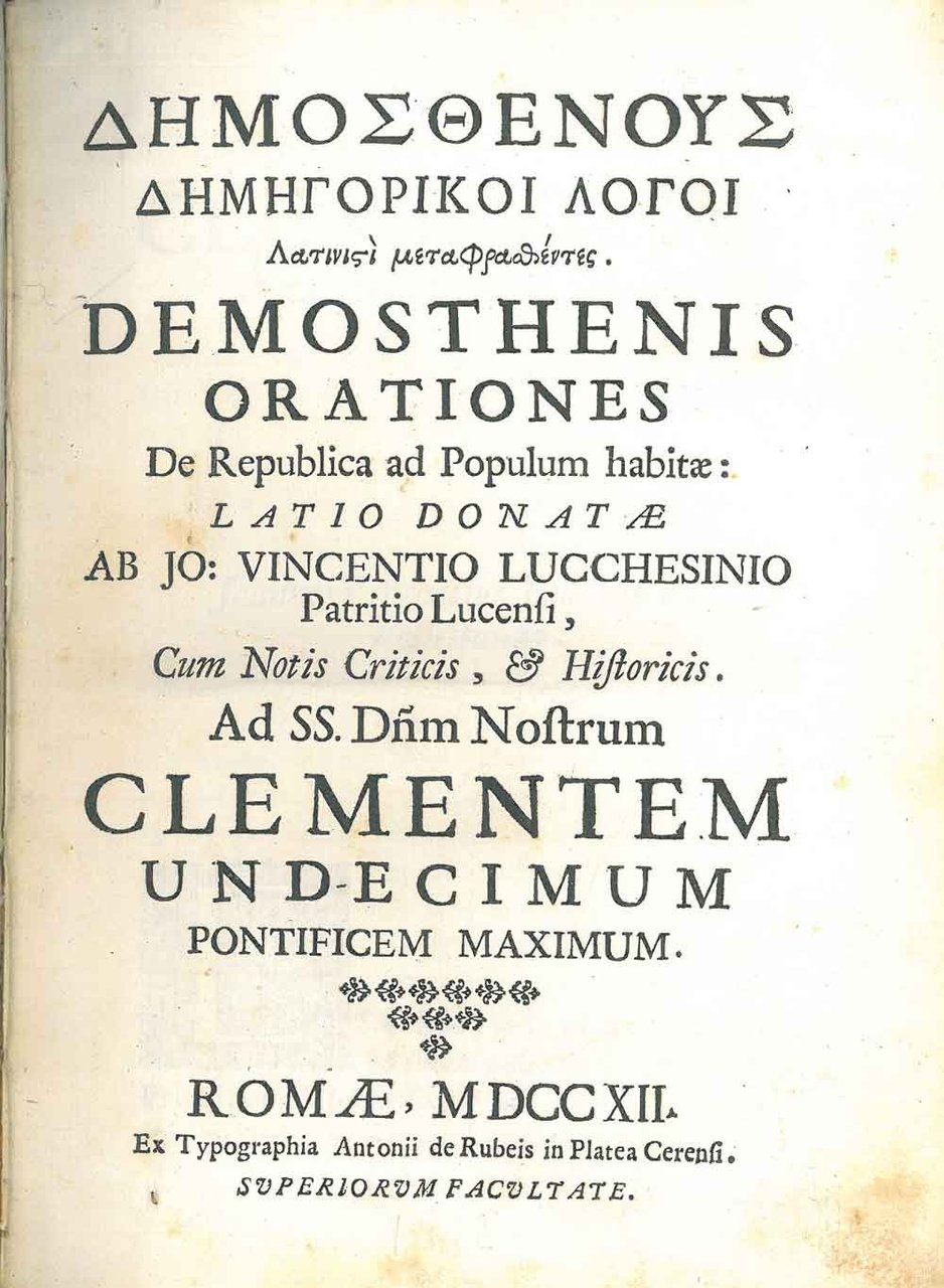Demosthenous Demegorikoi logoi Latinisi metaphrathentes. Demosthenis Orationes de republica ad populum habitae: Latio donatae ab Jo. Vincentio Lucchesinio. cum notis criticis, et historicis.