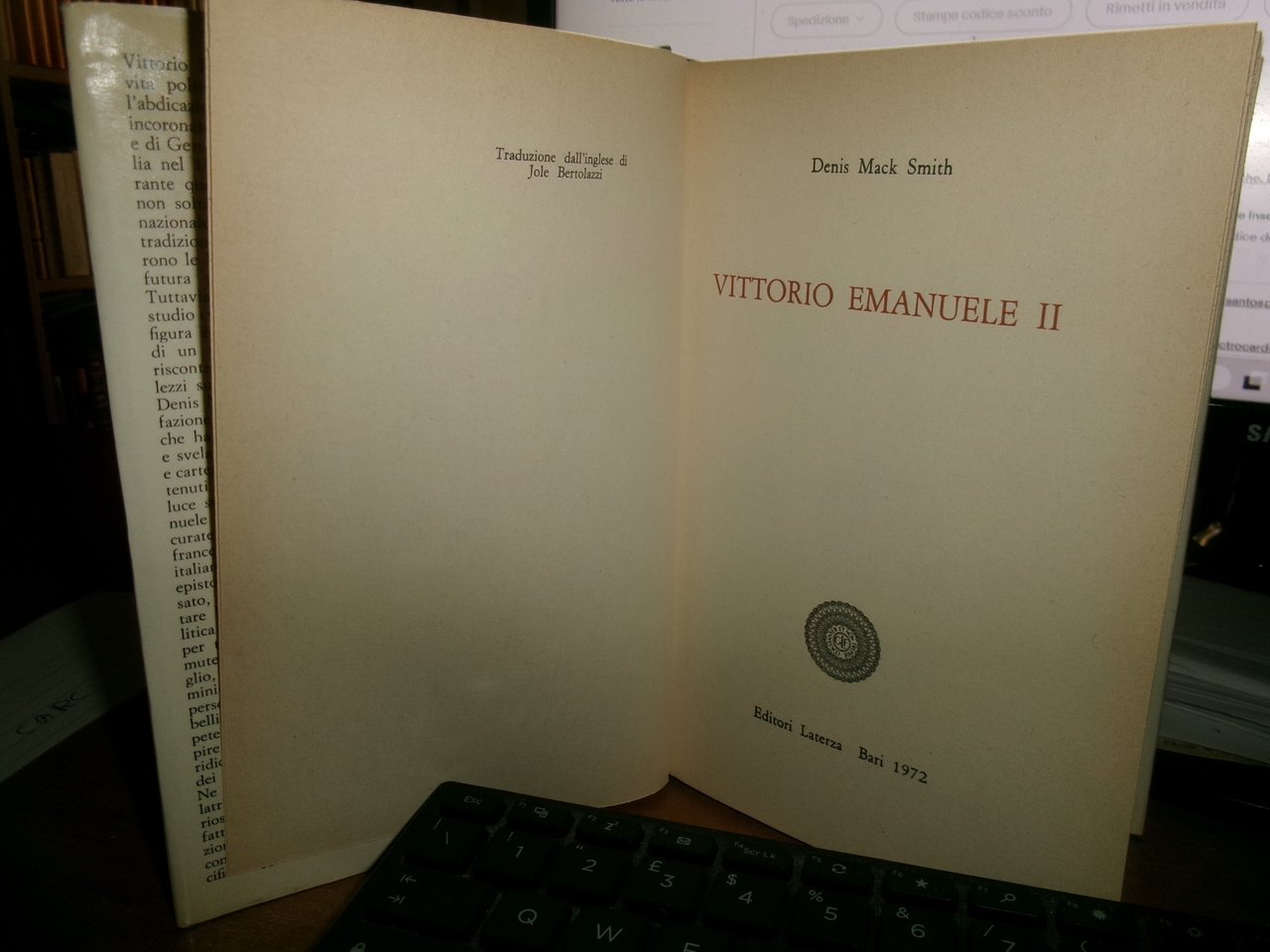 DENIS MACK SMITH. VITTORIO EMANUELE II. Bari, Editori Laterza, 1972. In-8°, tela edit. con sovracopertina. 387, (1) pp. Ben conservato. Neg. storia 2