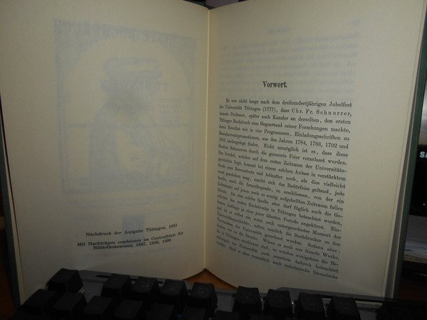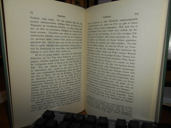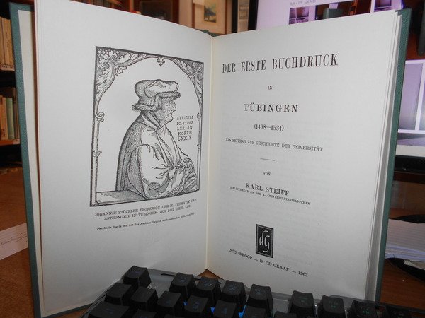 Der erste Buchdruck in Tübingen (1498-1534). Ein Beitrag zur Geschichte der Universität. In-8°, tela verde con titoli in oro. 254, (2), 31, (1) pp. Come nuovo. Uff. C - I - 7