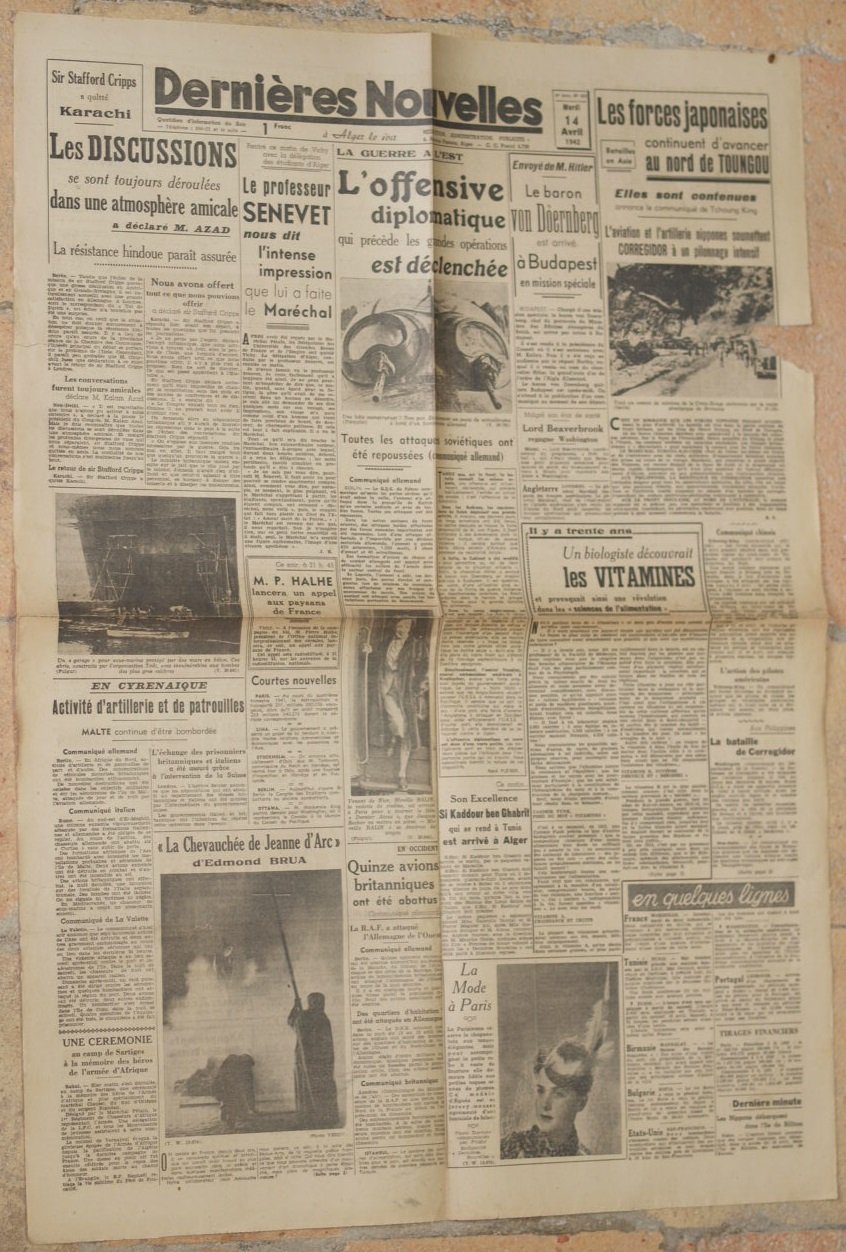In folio. Dim. 60x43 cm. Pp. 2. Numero del 14 aprile 1942 della rivista francese "Dernieres Nouvelles". Tra gli argomenti trattati: Halhe lancia un appello ai cittadini francesi, Il barone Von Doernberg, Le forze giapponesi continuano ad avanzare al nord di Toungou, In Cirenaica attività di artiglieria, "Le Chevauchèe de Jeanne D'Arc, Guerra nel Pacifico, Notizie da Algeri ecc. In buone condizioni. Raro. Brossura editoriale in discrete condizioni generali con lievi usure ai margini e dorso. Piegatura orizzontale e verticale. Parte mancante al margine destro con perdita di testo. All'interno le pagine si presentano in buone condizioni con rare fioriture. Usure ai margini. Piegature. Number of the 14th of April 1942 of the french magazine "Dernieres Nouvelles magazine". Between the issues treated: Halhe talks to french citizens, barone Von Doernberg, Japanese forces continue to go ahead the north of Toungou, In Cirenaica, "Le Chevauchèe de Jeanne D'Arc, war in pacific sea, News from Algeri etc. In good conditions Scarce copy. Editorial cover in fair general conditions slightly worn in the edges and spine. Vertical and horizontal foldings. Missing part in the right edge with missing text. Inside pages are in good conditions with occasional foxings. Wearings in the edges. Foldings.