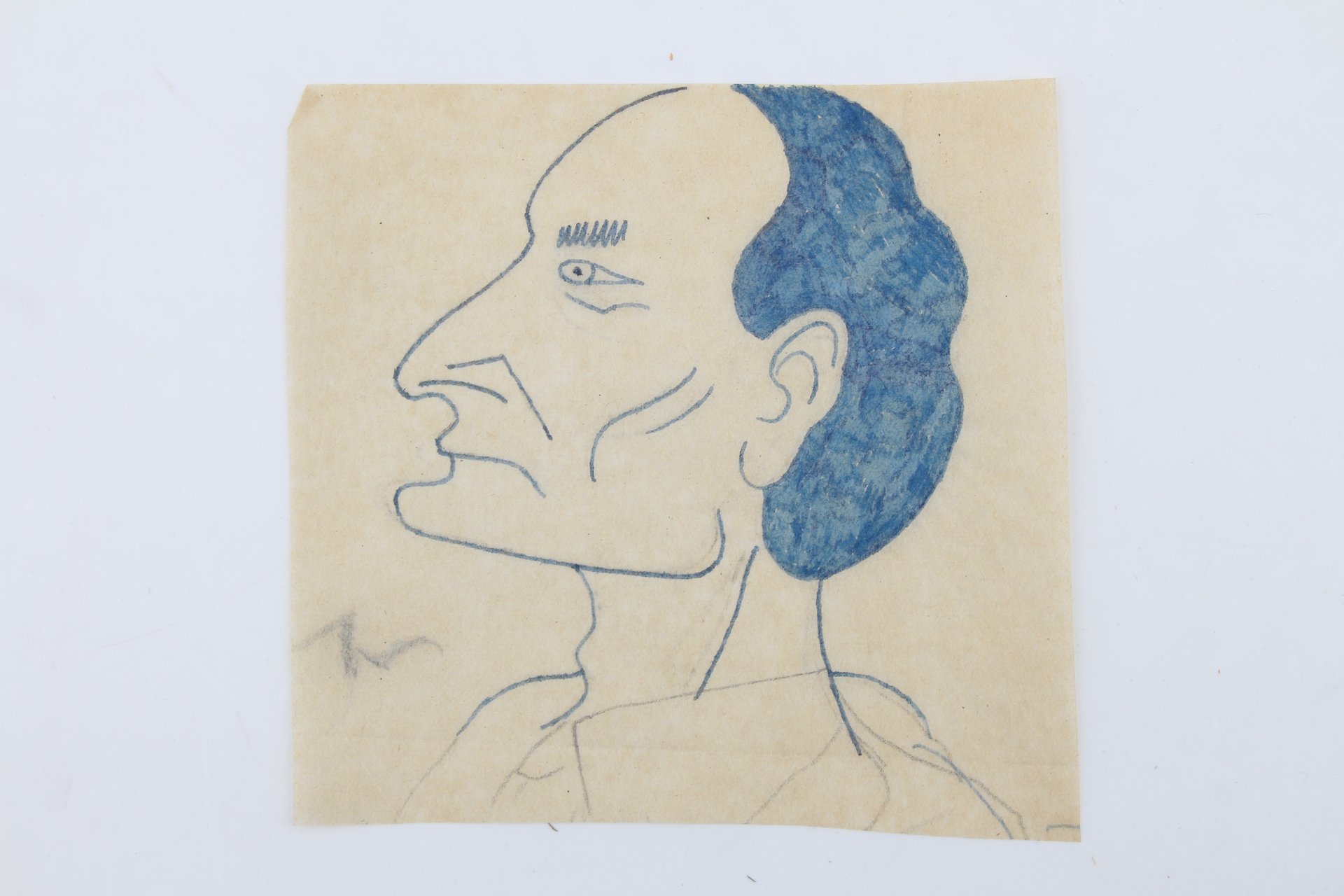 s. l. s. d. [ca 1935] | 10.50 x 10.50 cm | une feuille | [ENGLISH DESCRIPTION ON DEMAND] | Dessin original à l'encre bleue de Carlo Rim représentant son ami Antonin Artaud de profil. Le dessin, sans doute préparatoire, a été realisé sur papier calque. Carlo Rim fut un écrivain provençal, auteur notamment de Ma belle Marseille, un caricaturiste, un cinéaste et fut notamment l'ami de Fernandel, de Raimu et Marcel Pagnol mais aussi de Max Jacob et André Salmon qu'il rencontra à Sanary.