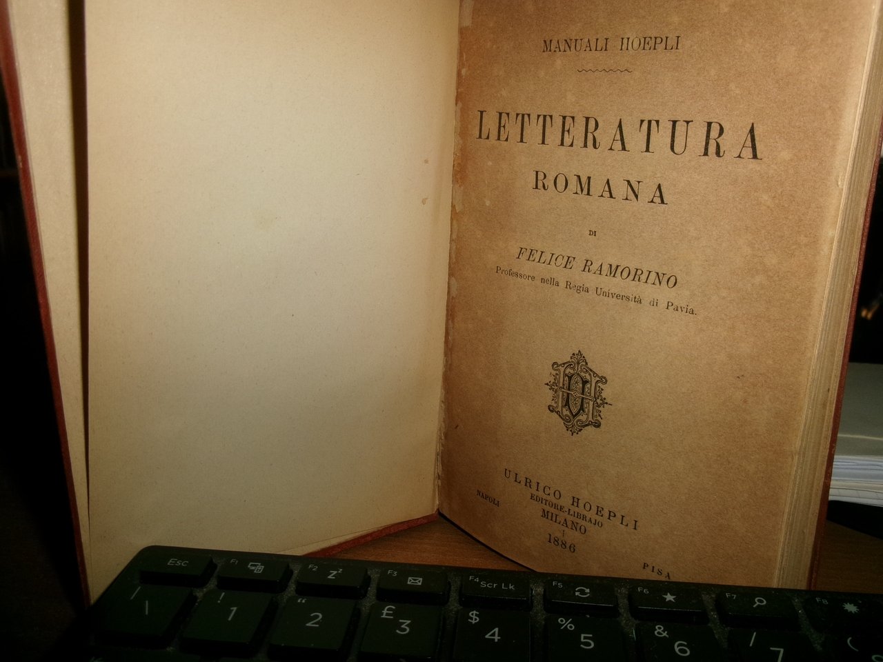di FELICE RAMORINO. LETTERATURA ROMANA. Milano, Ulrico Hoepli, 1886. In-16°, tela edit. iv, 290, (2) pp. Livi abrasioni sui piani ma ben conservato. Neg. mob. 19 Hoepli.