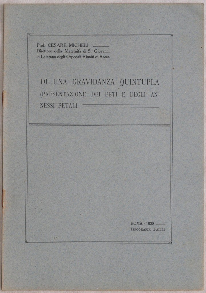 In 8. Dim. 26,5x19 cm. Pp. 7. Interessante pubblicazione del 1928 di ostetricia scritto da Cesare Micheli. La pubblicazione descrive una gravidanza quintupla con relativa presentazione dei feti e degli annessi fetali. All'interno tutti i vari dati e due planches fotografiche. In ottime condizioni. Copertina editoriale in ottime condizioni generali con lievi usure ai margini e dorso. Legatura in ottime condizioni. All'interno le pagine si presentano in ottime condizioni con rare fioriture. Interesting pamphlet of 1928 of obstetrics written by Cesare Micheli. The pamphlet describes a fifth pregnancy with relative description of phoetus. Inside different data and two photographyc planches. In very good conditions. Editorial cover in very good general conditions slightly worn in the edges and spine. Binding in very good conditions. Inside pages are in very good conditions with occasional foxings.