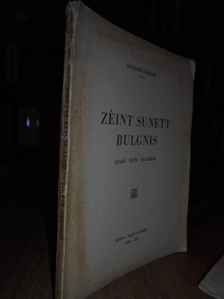 (Dialetto bolognese). BARONI, Odoardo. (Bologna), Edito dall' Autore, 1933. Zèint sunett bulgnis quasi tùtt alligher. In - 8°, br., cop. orig. 107, (1) pp. Edizione di pochi esemplari. Testo ciclostilato. In buono stato di conservazione.