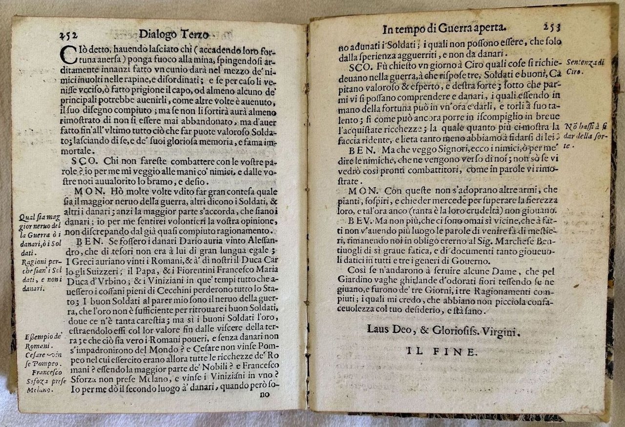Rara edizione originale del 1611 dello scritto di maggior impegno del ferrarese Paolo Brusantini (1552-1625), figura assai vivace nel quadro politico italiano del tempo. Questi fu governatore di Sassuolo dal 1601, dopo l'attentato a Marco Pio, in cui Brusantini fu sospettato di aver preso parte. Ebbe molti amici ed altrettanti nemici; fra quest'ultimi elenchiamo il Tassoni che potè dileggiarlo e dimostrarne tutto l'odio identificandolo con il personaggio del "Conte di Culagna", nella Secchia Rapita L'opera è struttrata in tre dialoghi ambientati nella villa estense di Spezzano ".che trattano tre modi di governo: in tempo di pace, di sospetto di guerra e di guerra aperta. Interlocutori sono il Laderchi, Ernesto Bevilacqua, poi governatore di Carpi e di Reggio, Alfonso Fontanelli, Fabio Scotti, Ippolito Bentivogli: tutti ferarresi e tutti viventi quando si stampava l'opera, che anche da questo trae parte del suo interesse, per essere il tentativo di teorizzare il dominio di nuovi gruppi." Cfr Diz. Bibl. degl'Italiani (v. 14 p. 685). Vignetta al frontespizio. Tagli rossi. In buone condizioni. Copertina in mezza pergamena con titolo manoscritto al dorso in discrete condizioni generali con usure ai margini e dorso. Segni di tarlo. Legatura in buone condizioni. Pagine in buone condizioni con rare fioriture. Segni di tarlo al margine di piegatura. In 8. cm. 19,5x14,5. Pp. (8)+253+(1).Scarce original edition of 1611 of the most important work by the Count from Ferrara Paolo Brusantini (1552-1625) a very commited person in that hystorical period. The work is dividd in three times places in the Estense Villa of Spezzano ".che trattano tre modi di governo: in tempo di pace, di sospetto di guerra e di guerra aperta. Interlocutori sono il Laderchi, Ernesto Bevilacqua, poi governatore di Carpi e di Reggio, Alfonso Fontanelli, Fabio Scotti, Ippolito Bentivogli: tutti ferarresi e tutti viventi quando si stampava l'opera, che anche da questo trae parte del suo interesse, per essere il tentativo di teorizzare il dominio di nuovi gruppi." Cfr Diz. Bibl. degl'Italiani (v. 14 p. 685). Vignette in the ttile page. Red external edges. In good conditions. Half parchment cover with handwritten title in the spine in good conditions lightly worn in the extremities. Worming. Binding in good conditions. Pages in good conditions with occasional foxing. Worming in the folding edge.In 8. cm. 19,5x14,5. Pp. (8)+253+(1).
