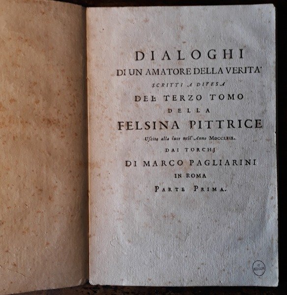 Dialoghi di un amatore della verità scritti in difesa del terzo tomo della Felsina Pittrice uscito alla luce nell'anno MDCCLXIX dai Torchi di Marco Pagliarini in Roma. Parte prima