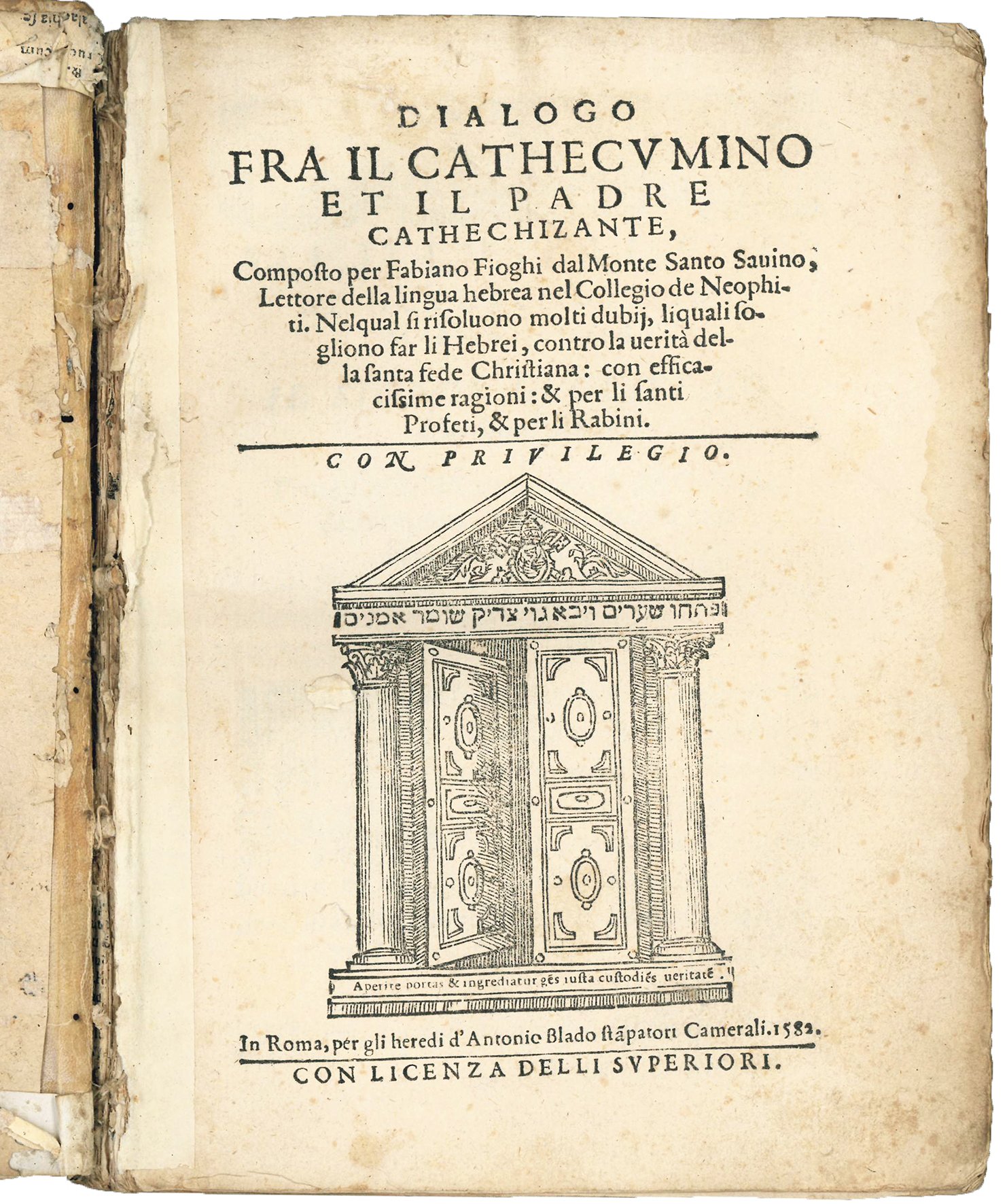 First edition (it was reprinted in Rome in 1611). Fioghi, a baptized Jew and Catholic theologian, worked as a catechist for Jews preparing to convert.