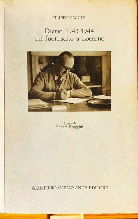 I ed. con tiratura limitata a 2200 esemplari: "Ventisette copie, con numerazione romana, rilegate in mezza pelle sono riservate "sibi et amicis" alla Direzione della Banca di Credito Commerciale e Mobiliare di Lugano, come pure settantadue copie con numerazione araba. / Mille copie, fuori commercio, sono a disposizione della Banca in occasione della dell'apertura dei nuovi sportelli dell'Agenzia nella città Vecchia a Locarno. Le altre sono messe in vendita" (dalla nota a p. 331): copia non numerata. "Collana di Lugano"VIII/ L+332/ brossura in cartoncino ruvido grigio con risvolti, titoli in nero e con una riproduzione di un ritratto fotografico in b/n del Sacchi al primo piatto (Filippo Sacchi al tavolo di lavoro, nella casa Rusca. Alle sue spalle il piccolo apparecchio con cui si captava anche Radio Londra. Grafica: Maurice Hoderas, Lugano). In antiporta un altro ritratto fotografico in b/n del Sacchi con la ripruzione in fac simile dell'autografo. Con inoltre alcune riproduzioni fotografiche in b/n in pagine patinate f.t.. Stato buono-ottimo. Indice: Filippo Sacchi; di Alessandro Galante Garrone - Ricordo di Filippo Sacchi; di Bruno Caizzi - Impegno civile nel giornalismo; di Renata Broggini - Avvertenze e ringraziamenti - Diario 1943 - Diario 1944 - Appemdice - Repubblica svizzera vergine saggia - Immagini e documenti - Indicee dei nomi.