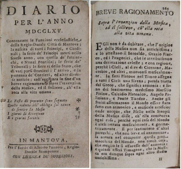DIARIO PER L’ANNO MDCCLXV. Coll'aggiunta in fine d'un breve ragionamento sopra l'invenzion della Musica ed il sollievo ch'ella reca alla vita umana.