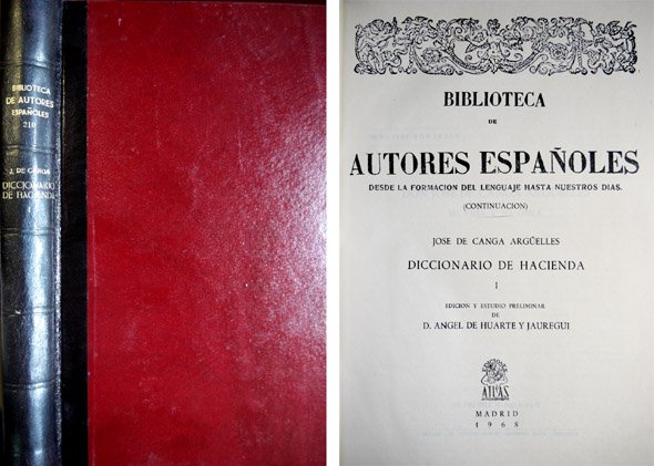 Madrid, 1968 [BAE]. 4to. mayor; XC pp., 413 pp., 1 h. Encuadernación en media piel. Único volúmen publicado en la BAE de los cinco que conformaban la edición original de Londres, 1826 - 1827. Es de gran interés el estudio introductorio de Angel Huarte que lleva el título de "Don José de Canga Argüelles. Su vida y su obra".