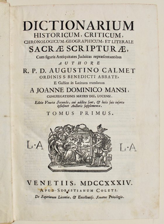 Dictionarium historicum, criticum, chronologicum, geographicum, et literale Sacrae Scripturae cum figuris Antiquitates Judaicas …e Gallico in Latinum translatum a Joanne Dominico Mansi. Editio veneta secunda…