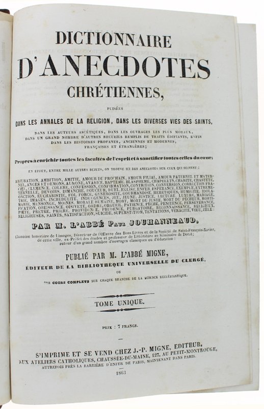 DICTIONNAIRE D'ANECDOTES CHRETIENNES, puisées dans les annales de la religion, dans les diverses vies des saints, dans les auteurs ascetiques. TOME UNIQUE. | Libri antichi e moderni | Jouhanneaud Paul.