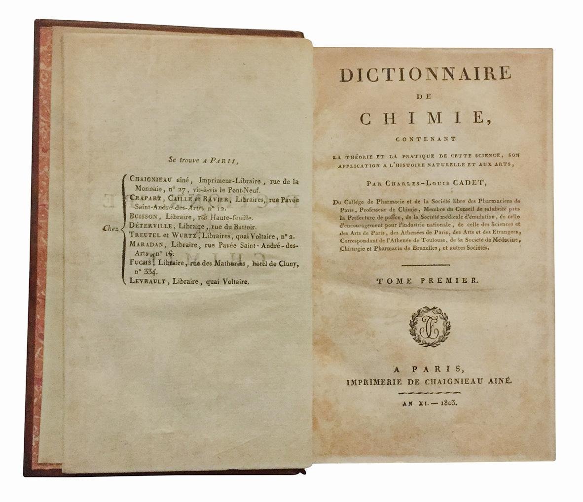 PRIMA EDIZIONE di questo importante dizionario di chimica, nel quale l'autore riprende i concetti sviluppati da Pierre Joseph Macquer quarant'anni prima, aggiornandoli alla luce delle ultime scoperte, in particolare di quelle di Lavoisier. “As a scientist Cadet is noteworthy for his part in the diffusion and popularization of the New Chemistry rather than for any specific discovery. His most important work, the four-volume Dictionnaire de Chimie, published in 1803 and dedicated to Fourcroy, replaced the old chemical dictionary of Macquer. Cadet's Dictionnaire clearly elucidated the revolutionary changes that had occurred in chemistry and in chemical nomenclature” (DSB, III, p. 6).“Cadet's Dictionnaire follows the form of Macquer's and brings it up to date. It is an entirely new work designed to be useful to chemists in need of a compact dictionary. The table of authors in T. IV gives references to their work and where it is quoted in the dictionary” (Cole).Figlio illegittimo di Luigi XV e di Maria Teresa Boisselet, indirizzato allo studio della farmacia, il giovane Charles Louis decise tuttavia di dedicarsi prima alla letteratura e quindi alla giurisprudenza. Allo scoppio della Rivoluzione vi aderì con entusiasmo, non esitando però a condannare gli eccessi del tribunale rivoluzionario. Accusato di aver partecipato all'insurrezione del 13 Vendemmiaio anno IV (1795), fu condannato in contumacia e dovette pertanto nascondersi per tre anni nel Berry. Ritornato a Parigi dopo la morte del padre putativo (Louis Claude Cadet de Gassicourt) dovette abbandonare la sua vita dissipata ed abbracciare la professione farmaceutica. Fu quindi nominato segretario generale del nuovo consiglio sanitario di Parigi e nel 1809 ordinario farmacista di Napoleone. Parallelamente si dedicò alla stesura di diverse opere scientifiche. Successivamente fu nominato segretario generale della società farmaceutica di Parigi, prima di ottenerne la presidenza nel 1818. Dopo il ritorno di Napoleone dall'isola d'Elba, Gassicourt fu chiamato a sostituire Deyeux come suo primo farmacista. Con il crollo dell'impero abbandonò la vita pubblica, ritirandosi a vita privata. Nel 1815 ricevette da Luigi XVIII la Legione d'Onore e nel 1821 fu eletto membro a pieno titolo dell'Accademia di Medicina.