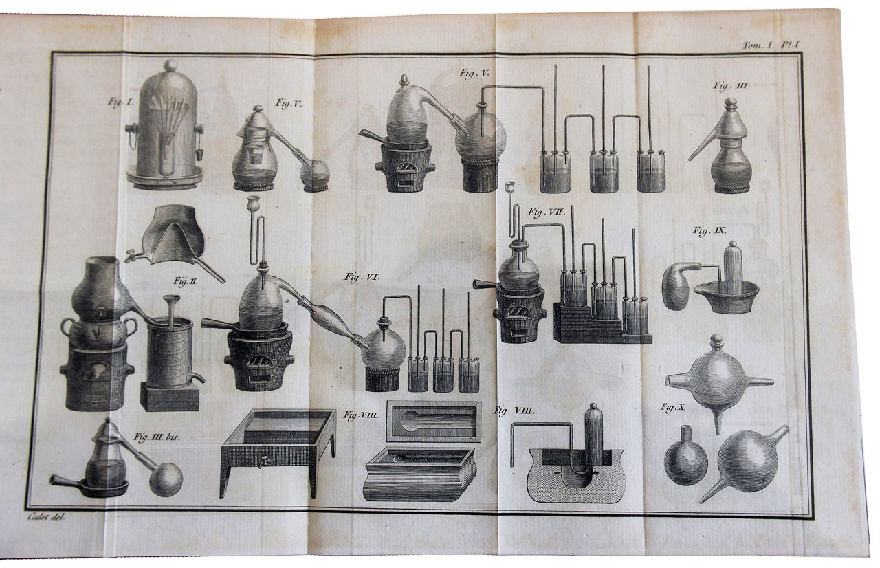 Quattro volumi in 8vo (mm. 198x116). Pp. CC, 448 ed 1 tavola calcografica ripiegata fuori testo; pp. 560 e 3 tavole ripiegate; pp. 726 ed 1 tavola ripiegata; pp. 607, [1] ed 1 tavola ripiegata. Occhietto all'inizio di ogni tomo. Le sei tavole mostrano apparecchiature chimiche. Elegante legatura coeva in pieno vitellino beige, dorso riccamente decorato con fregi di gusto neoclassico impressi in oro e duplice tassello in marocchino marrone e verde recante titolo e numero del volume, dorature lungo i bordi dei piatti, tagli spruzzati, risguardi marmorizzati (cerniere e cuffie di alcuni volumi lievemente danneggiati). Lievi aloni e minime fioriture marginali su poche carte. Esemplare freschissimo.