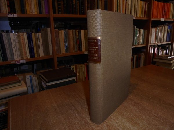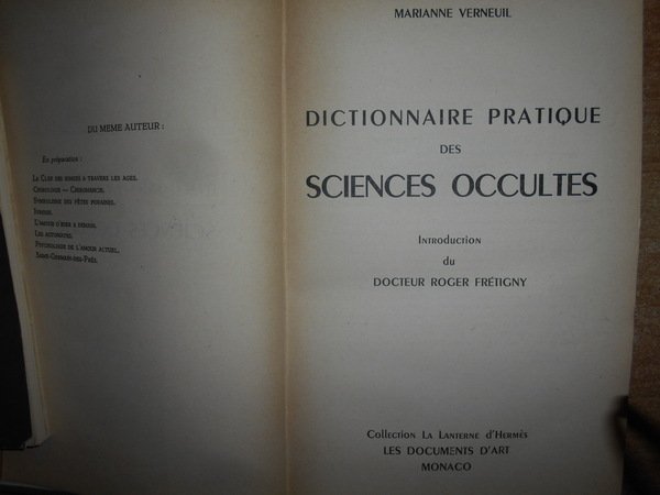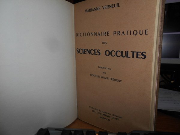 (Occultismo) VERNEUIL MARIANNE. Monaco, Collection La Lanterne d' Hermès Les Documents d' Art, 1950. DICTIONNAIRE PRATIQUE des SCIENCES OCCULTES. Introduction du Docteur Roger Frétigny. In-8°, tela con titolo in oro entro tassello al dorso, copertine originali conservate. 489 pp. con alcune illustrazioni in bianco e nero nel testo. Ottimo esemplare in legatura recente con le copertine originali conservate. Neg. esot. mob. 102
