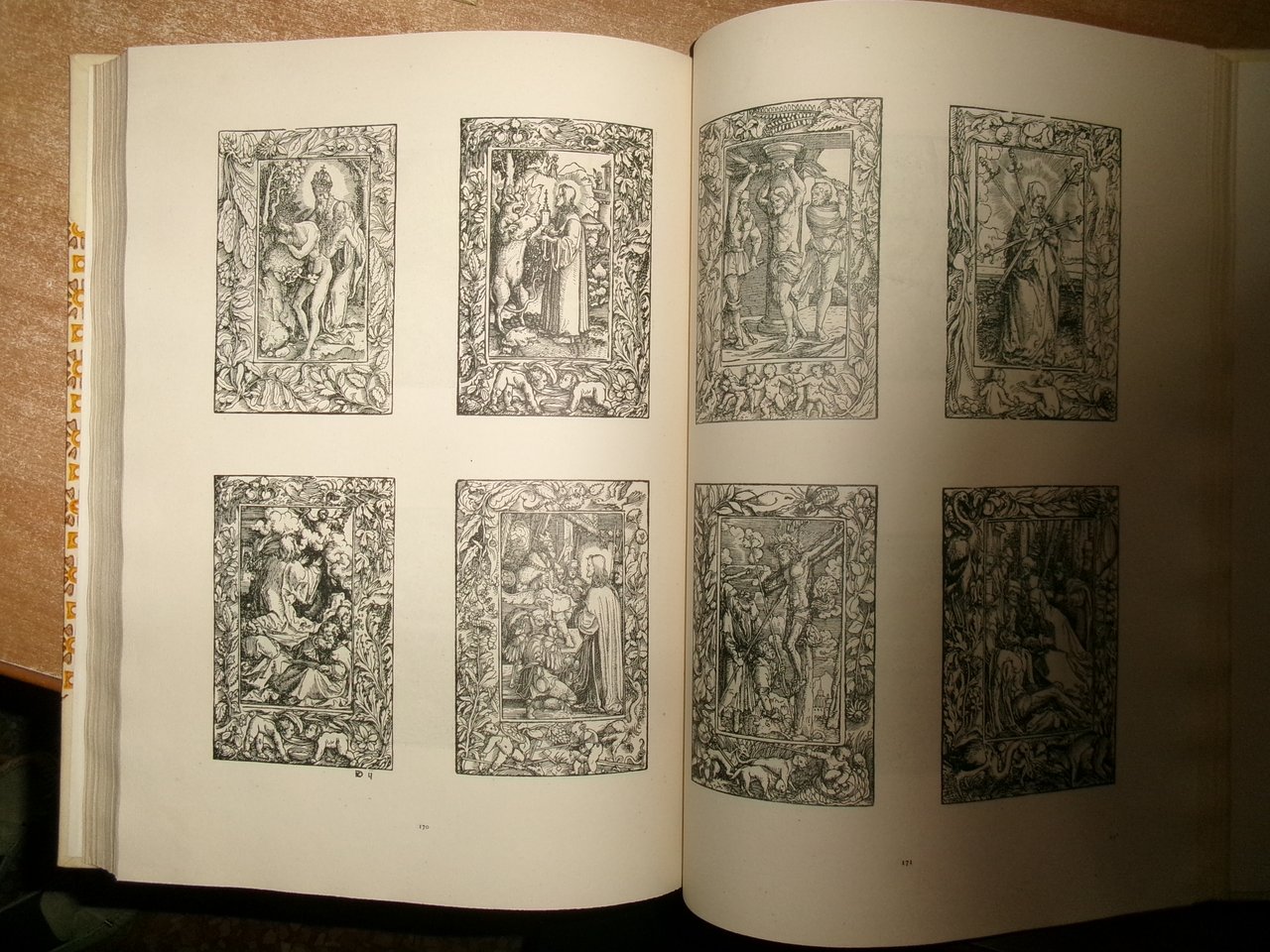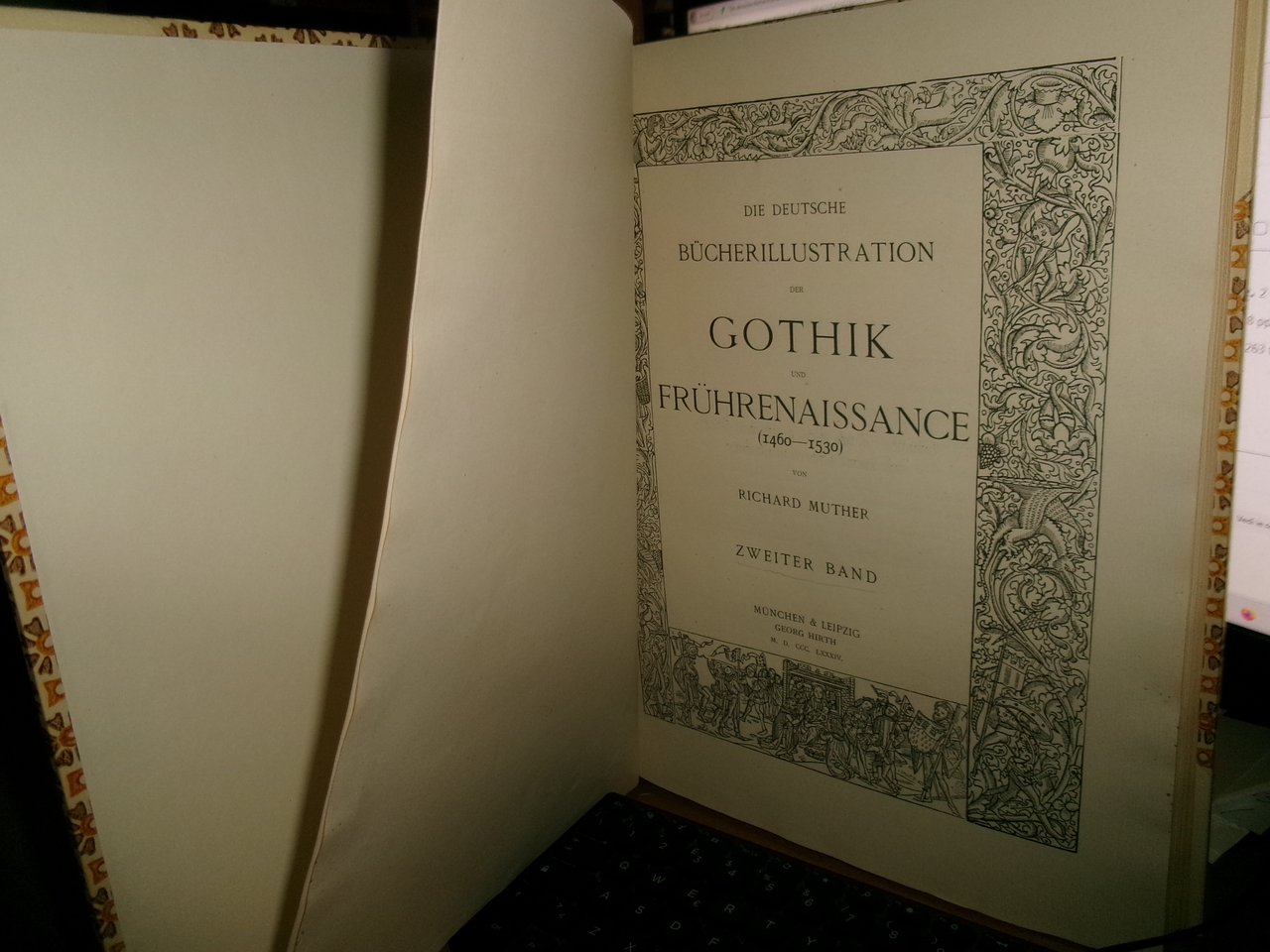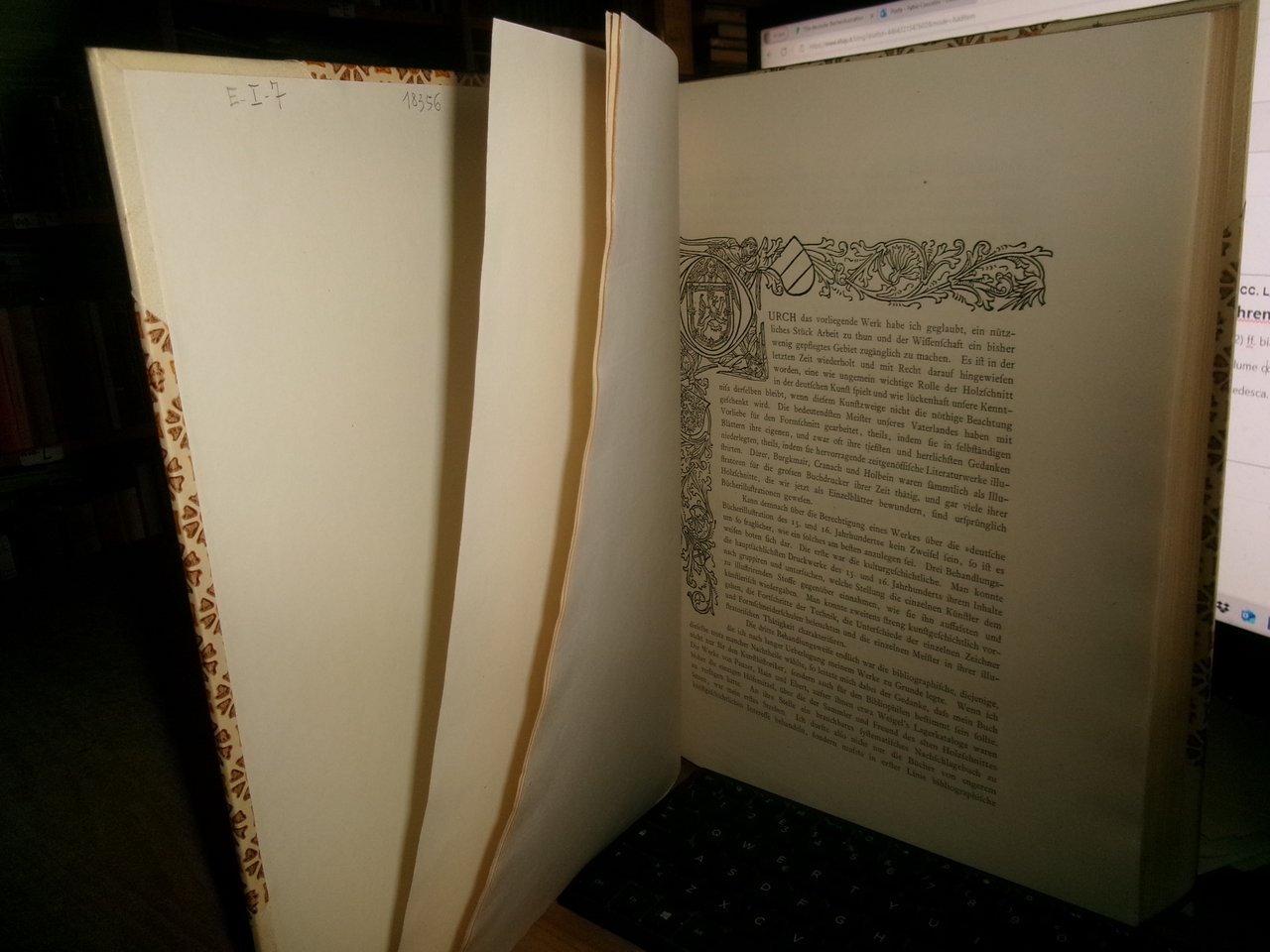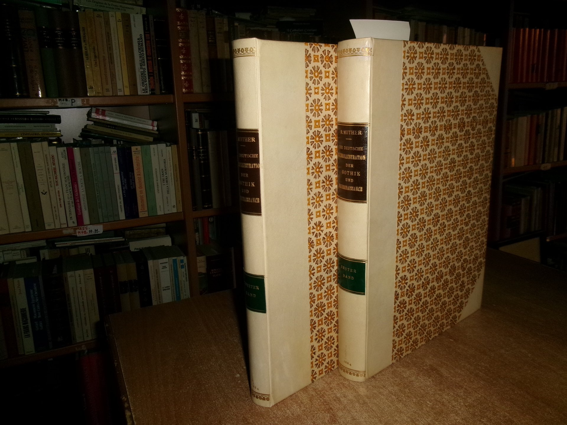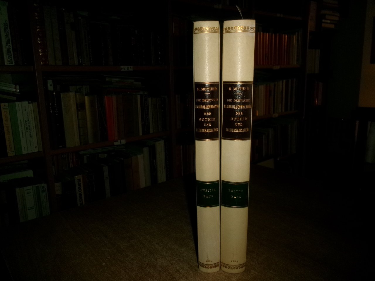 Die deutsche Bücherillustration der Gothik und Frührenaissance. 2 volumi in-folio, m-pergamena con larghe punte, titoli in oro su due tasselli ai dorsi. Erster band (2) ff. bianchi, xvi, 298 pp., (2) ff. bianchi con numerose illustrazioni n.t.; Zweiter band (2) ff. bianchi, viii, 263, (3) pp. Volume composto da 263 tavole di illustrazioni/riproduzioni anche a piena pagina. Bellissimo esemplare in lingua tedesca. Uff. E - I - 7