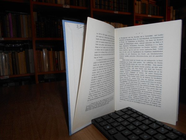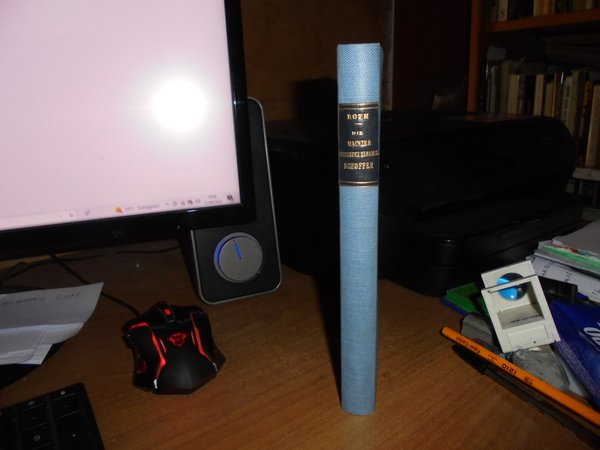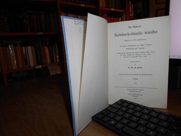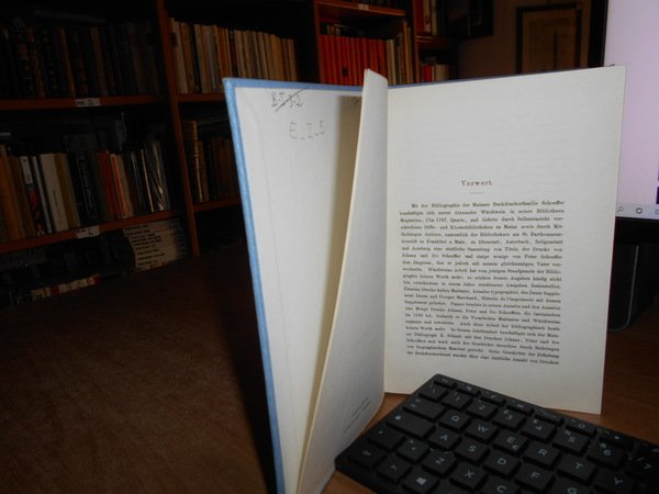 Die Mainzer Buchdruckerfamilie Schöffer: Während des XVI. Jahrhunderts und Deren Erzeugnisse zu Mainz, Worms, Strassburg und Venedig, Enthaltend die . des Jüngeren 1508-1542, und des Jvo Schoeffe. In-8°, tela azzurra con titolo in oro entro tassello al dorso. viii, 250 pp. Ottimo stato. Uff. E - I - 5