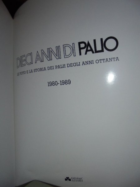 Dieci anni di Palio. Le foto e la storia dei palii degli anni ottanta 1980-1989. Roberto Barzanti. Gianni Tiberti. Siena, Al.Sa.Ba., 1990. In-4°, tela con sovracopertina, 199 pp. con numerose belle illustrazioni fotografiche a colori anche a piena e doppia pagina. La sovracopertina è leggermente sciupata. Il libro è come nuovo. Neg. sotto Hoepli