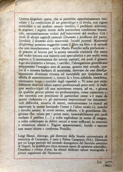 Questa singolare opera, che si potrebbe opportunamente intitolare «Le confessioni di un ginecologo» ci rivela, con rigore scientifico e un pudore umano insolito, i problemi scottanti, le angosce, i segreti intimi della particolare condizione femminile, necessariamente violati dall'intervento del medico. Già i titoli di alcuni capitoli centrali (Drammi e problemi del parto; Sterilità; I drammi della maternità; Incubi paterni; Maternità illegittima) possono suggerire come il libro sia fitto «di episodi che non mancheranno - scrive Mario Pomilio nella prefazione - di piacere al lettore per la stessa naturale curiosità che nasce dal veder toccata una materia così specialistica e per molti versi segreta». L'arretratezza dei servizi sanitari, coi quali il ginecologo era costretto a lottare; i sacrifici, l'abnegazione giustificano pienamente l'energico atto di accusa, quanto mai attuale, contro il «sistema barbaro di assistenza, derivato da una disorganizzazione diventata cronica ed incurabile per insipienza ed abulia di amministratori», contro la «lotta subdola, meschina, estenuante lungo i corridoi degli ospedali». Vi sono poi mirabilmente descritti taluni aspetti professionali poco noti: le indagini medico-legali (di una minorenne veneta, ad es., «giunta da qualche giorno presso un professionista, come cameriera», che racconta con precisione di particolari come «è stata da questi violentata»); gli interventi improvvisati tra innumerevoli difficoltà, miseria di mezzi, ostruzionismo («riuscii ad asportare la massa lasciando l'utero e l'altro ovaio»); nonché i risvolti umani, le storie intime, sofferte, «le gravidanze illegittime che, celate per i primi mesi, inesorabilmente più tardi svelano il peccato [.] a volte esplodono in scene di sangue, a volte culminano in delitti oscuri o sono soffocati in ermetici e misteriosi silenzi». Pagine appassionanti, lucide «narrate con mano sicura» conferma Pomilio.