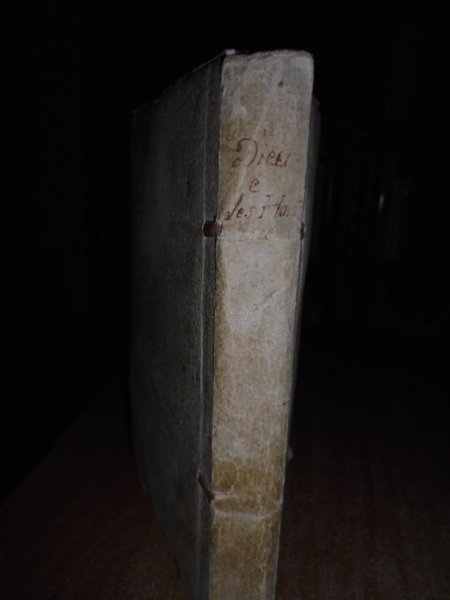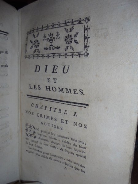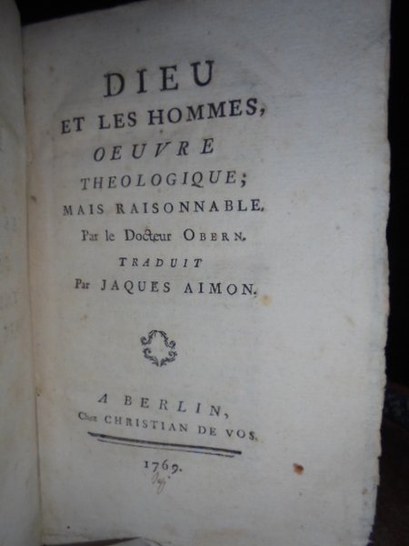 (VOLTAIRE) (François-Marie Arouet di). Berlin, Chez Christian de Vos, 1769. Dieu et les Hommes, Oeuvre théologique; mais raisonnable. Par le Docteur Obern. Traduit par Jaques Aimon. Edizione originale. In-8°, leg. coeva in cartone. viii, 264 pp. Ottimo esemplare intonso con barbe, nella sua legatura officinale. Una delle opere più importanti dell' arsenico polemico anti-cristiano Voltaire. Dio e gli uomini è un attacco frontale contro la tradizione religiosa giudeo-cristiana. (R. Mortier). Bengesco, II, 178. Casa