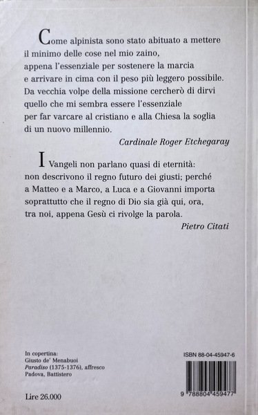 Come alpinista sono abituato a mettere il minimo delle cose nel mio zaino, appena l'essenziale per sostenere la marcia e arrivare in cima con il peso più leggero possibile. Da vecchia volpe della missione cercherò di dirvi quello che mi sembra essere essenziale per far varcare al cristiano e alla Chiesa la soglia di un nuovo millennio. (Cardinale Roger Etchegaray)