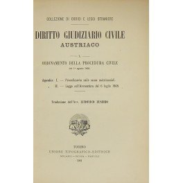 Diritto Giudiziario Civile Austriaco. Vol. I - Ordinamento della Procedura Civile del 1 agosto 1895. Appendice I - Procedimento nelle cause matrimoniali. Appendice II - Legge sull'Avvocatura del 6 luglio 1868. Vol. II - Legge sulla Organizzazione dei Tribunali del 27 novembre 1896. Legge sulla Giurisdizione e sulla Competenza del 1 agosto 1895. Ordinamento della Esecuzione del 27 maggio 1896 con note tratte dai lavori preparatori. Appendice Legge generale sui libri fondiari del 25 luglio 1871