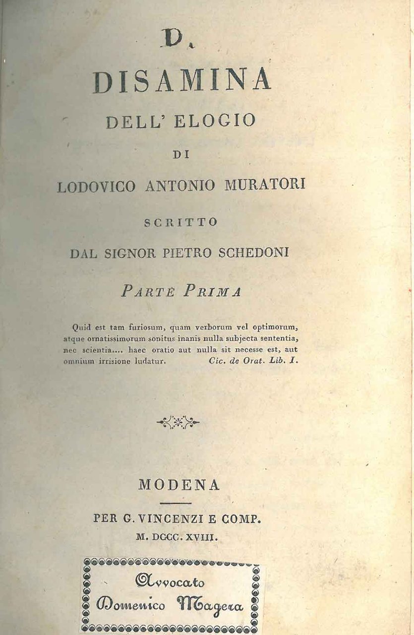 Disamina dell'elogio di Lodovico Antonio Muratori. Parte prima, Modena, Vincenzi, 1818. Legato a: Documenti all' aggiudicazione del premio . per l'elogio di L. A. Muratori. Modena, Società Tipografica, 1819, legato a: Risposta di Pietro Schedoni ad u