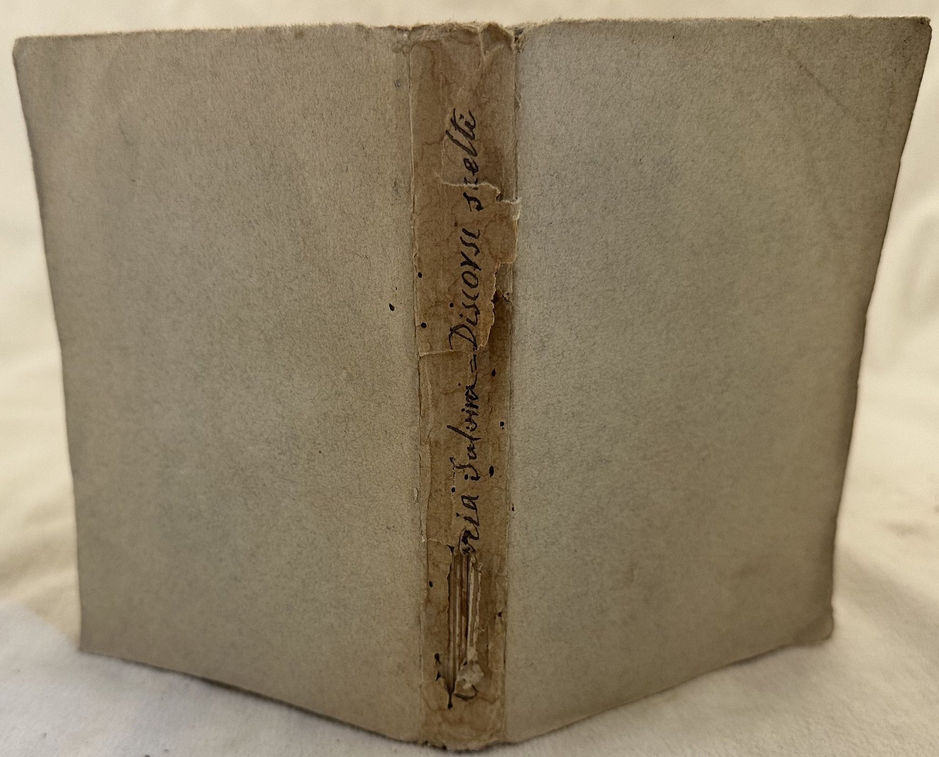 Edizione del 1844 di questa raccolta di discorsi e lettere del letterato fiorentino Antonmaria Salvini (1653-1729). Tra i discorsi presenti: Del metodo di studiare, Della lingua ebrea, Della lingua greca, Della lingua latina, Della lingua Toscana. Firma al frontespizio. L'opera è in un volume ed è completa. In discrete condizioni. Copertina morbida coeva con titolo manoscritto al dorso in buone condizioni generali con lievi usure ai margini e dorso. Rotture e mancanze. Legatura in mediocri condizioni con rotture. All'interno le pagine si presentano in buone condizioni con fioriture. In 16. Dim. 16,5x11 cm. Pp. VII+231.Edition of 1844 of this collection of speeches and letters by the florentine man of letters Antonmaria Salvini (1653-1729). The speeches inside: the way to study, About jewish, greek, latin, Tuscan language. Signature in the title page. The work is in one volume and it is complete. In fair conditions. Soft coeval cover with handwritten title in the spine in good general conditions lightly worn in the extremities. Cracks and lackings. Binding in poor conditions with cracks. Inside pages are in good conditions with foxing. In 16. Dim. 16,5x11 cm. Pp. VII+231.