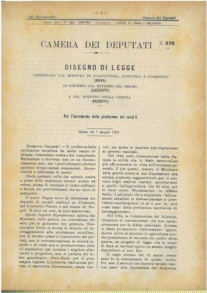 Disegno di legge Per l'incremento della produzione dei cavalli. Seduta del 7 giugno 1904