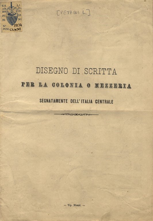 [Pisa], Tip. Nistri, [c. 1870], in-4, nato senza brossura, pp. 19, [1]. Si tratta d'un progetto di contratto colonico firmato in calce L. Petrini.