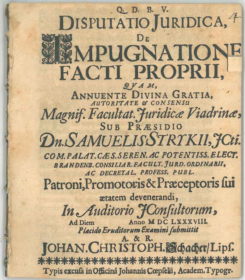 Disputatio juridica De Impugnatione Facti Propri. In Auditorio JConsultorum. Placido Eruditorum Examini Submittit