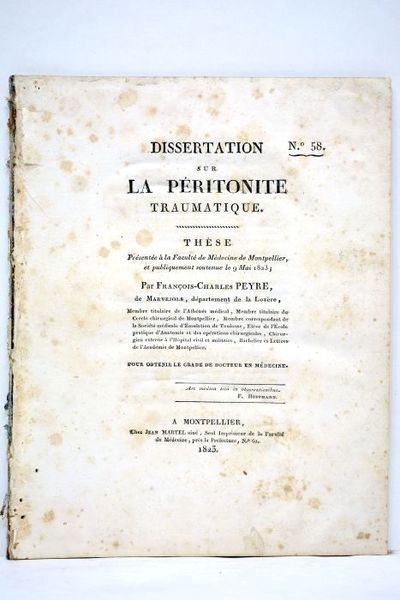 Dissertation sur la péritonite traumatique. Thèse présentée à la Faculté de Médecine de Montpellier, et publiquement soutenue le 9 mars 1823.
