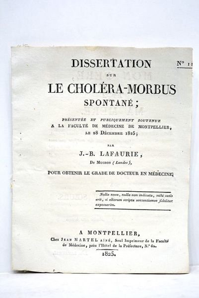 Dissertation sur le choléra-morbus spontané. Présentée et publiquement soutenue à la Faculté de Médecine de Montpellier le 28 décembre 1825.