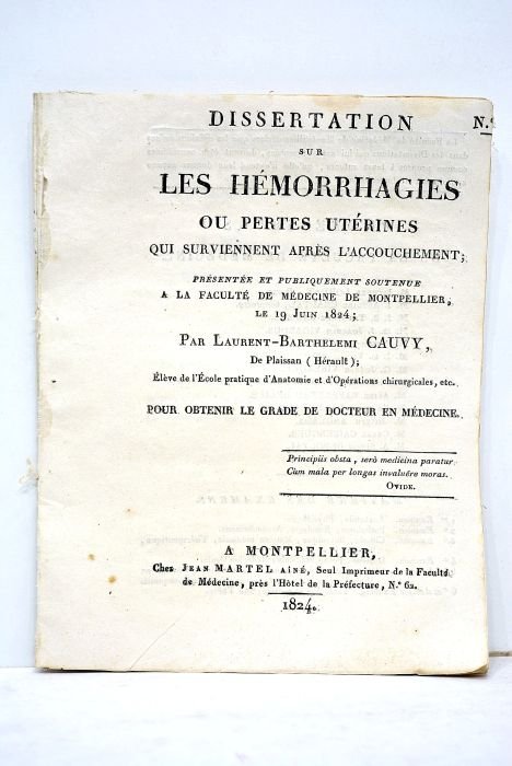 Dissertation sur les hémorrhagies ou pertes utérines qui surviennet après l'accouchement. Présenté et publiquement soutenu à la Faculté de Médecine de Montpellier le 19 juin 1824.